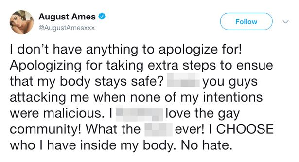 In december 2017, August Ames was about to film an adult film with a person that she had never worked with before. They decided to talk together and get to know each other. The man then said that he worked on a gay adult film a few days ago. When he said this, August Ames decided to no longer work with him after all, and she left the set. Another woman replaced her, and the man was not fired. Later the same day, in the evening, Miss Ames log on to her Twitter and then wrote this tweet about working with men who work on gay scenes.